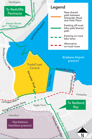 The shared path between Schneider Road in Eagle Farm and Viola Place at the airport precinct fills what had been a significant gap in the cycle network. Riders travelling from Brisbane’s southside via the Gateway Bridge now have improved access to the airport.